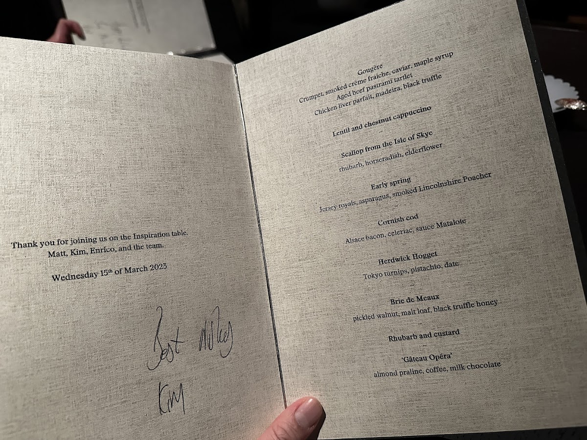 "Complete freedom to act as one wishes" The Carte Blanche menu focuses on discovery and the element of surprise. This experience is about a moment of 'letting go'; giving Chef Patron Matt Abe the opportunity to create you an entirely bespoke menu drawing from inspiration, creativity, and seasonality, whilst working with the best artisan providores and purveyors from around the world per person
